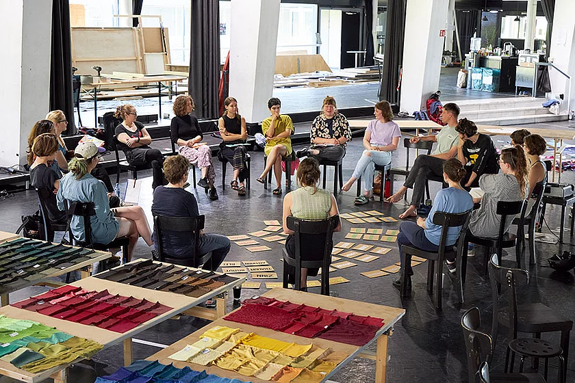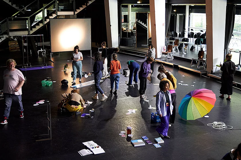 Der vierte Workshop "Something BLUE – Kunst der Zukunft" bildete vom 15. bis zum 20. Juni 2024 den Abschluss der Reihe und beschäftigte sich mit Ansätzen für eine nachhaltige Zukunft auf der Bühne. Es entstand ein Raum für Reflexion und Diskussion zur Frage, welche Fähigkeiten Szenograf*innen der Zukunft benötigen. Das Programm thematisierte die blauen Elemente Luft und Wasser in ihren ästhetischen, philosophischen und ökopolitischen Bedeutungen. Dabei lag der Fokus auf der gemeinsamen Lektüre, dem Austausch und der Auseinandersetzung mit künstlerischen Arbeitsweisen. Angeleitet wurde der Workshop von der Philosophin Melanie Sehgal von der Bergischen Universität Wuppertal und dem Theaterwissenschaftler und Dramaturgen Maximilian Haas von der Universität der Künste Berlin. Die Researcherinnen Jacqueline Klingen und Madeleine Raabe aus der Abteilung Nachhaltige Energie- und Industriesysteme am Wuppertal Institut boten einen wissenschaftlichen Beitrag zu planetaren Grenzen und natürlichen Senken. Ergänzt wurde der Workshop durch Yoga-Bewegungseinheiten und endete mit dem gemeinsamen Frühstücks-Dialog "Kunst trifft Wissenschaft" am Wuppertal Institut, bei dem sich Workshop-Szenograf*innen mit Mitarbeitenden des Wuppertal Instituts austauschten.