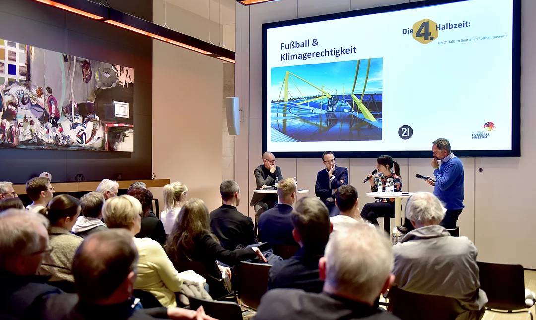 Sportliche Großereignisse und Nachhaltigkeit – das geht per se erst einmal nicht Hand in Hand. Ob und wie es gelingen kann, den Profifußball klimaschonender zu organisieren: Darüber diskutierten Carsten Cramer, Sprecher der Geschäftsführung von Borussia Dortmund, der RWE-Vorstandsvorsitzende Dr. Markus Krebber und Dr. Imke Schmidt, Co-Leiterin des Forschungsbereichs Zirkuläre Gesellschaft am Wuppertal Institut, am 3. März 2026 beim 21-Talk "Die 4. Halbzeit" im Deutschen Fußballmuseum. Es wurde ein Abend, der neben ambitionierten und kontroversen auch unterhaltsame und sogar launige Momente hatte. Moderator Gregor Schnittker leitete mit einer aus BVB-Sicht durchaus provokanten Feststellung ein: "Dem Klima ist es egal, wer Deutscher Meister wird!"