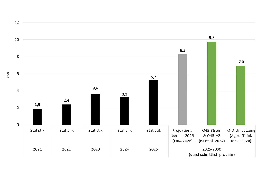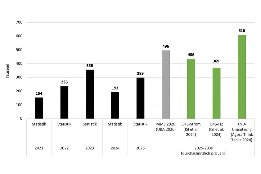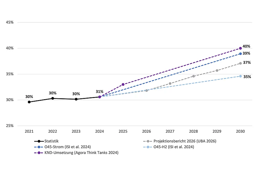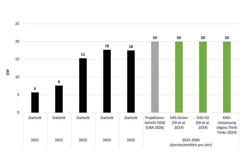 Im Folgenden wird (angesichts fehlender Detail-Untersuchungen) vereinfacht von einem um ein Viertel reduzierten jährlichen Ausbau der Windenergie an Land und der Photovoltaik ab dem Jahr 2027 ausgegangen, sollten die bisher bekannt gewordenen Pläne umgesetzt werden. Dies erscheint aufgrund der hohen Abhängigkeit des Marktes von verlässlichen Rahmenbedingungen nicht unwahrscheinlich. In dem Fall könnten die Treibhausgasemissionen im Jahr 2030 um etwa 15 Mt CO2-Äq. höher liegen als bei Beibehaltung der derzeitigen Bestimmungen.
