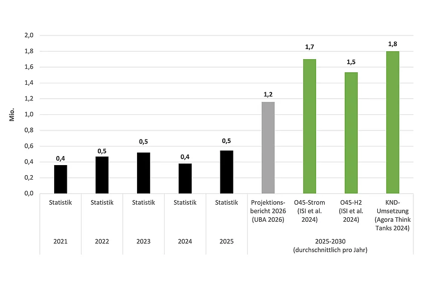 Das nun im Kabinett verabschiedete Klimaschutzprogramm zielt darauf ab, die sich aus dem Projektionsbericht des Jahres 2025 ableitende ("alte") Klimaschutzlücke zu schließen. Mittlerweile ist aber davon auszugehen, dass die tatsächliche Klimaschutzlücke im Jahr 2030 deutlich höher ausfallen wird, als in dem vor etwa einem Jahr veröffentlichten Projektionsbericht angenommen wurde. Der seit knapp zwei Wochen vorliegende neue Projektionsbericht, der die energie- und klimapolitischen Rahmenbedingungen bis etwa November 2025 berücksichtigt, attestiert für das Jahr 2030 eine größere Lücke zwischen der zu erwartenden Entwicklung der Treibhausgasemissionen und dem Zielwert nach KSG. So liegen im Projektionsbericht 2026 für das Jahr 2030 die erwarteten Emissionen rund 5 Mt höher als noch im Projektionsbericht 2025 erwartet. Die Klimaschutzlücke für das Jahr 2030 steigt demnach von rund 25 Mt CO2-Äq. auf rund 30 Mt CO2-Äq.