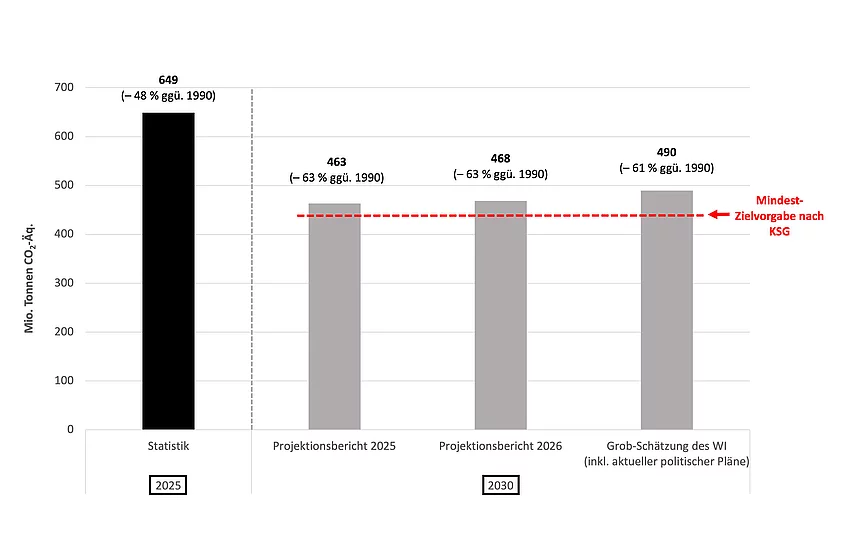 Das heute vom Bundeskabinett verabschiedete Klimaschutzprogramm 2026 wird aller Voraussicht nach nicht ausreichen, um das im Bundes-Klimaschutzgesetz verankerte Ziel der Minderung der Treibhausgasemissionen bis zum Jahr 2030 um mindestens 65 % (gegenüber 1990) zu erreichen. Denn die "Klimaschutzlücke", d. h. die nach derzeitigem Stand zu erwartende Zielverfehlung im Jahr 2030, ist deutlich höher als im Klimaschutzprogramm unterstellt. Dies liegt insbesondere an aktuellen energiepolitischen Plänen der Bundesregierung – allen voran dem Gebäudemodernisierungsgesetz (GMG) und der Novelle des Erneuerbare-Energien-Gesetzes (EEG) –, deren Klimawirkungen im Klimaschutzprogramm unberücksichtigt bleiben.