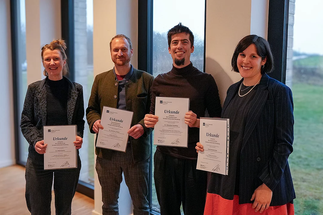 Vergeben wurden auch die Lehrpreise der Fakultät III. Studierende und Lehrende haben hier die Möglichkeit, besonders gelungene Lehrveranstaltungen der Dozierenden einzureichen. Bei der Auszeichnung spielt eine gute Verknüpfung von Theorie und Praxistransfer sowie eine gelungene Vermittlung der Themen eine wichtige Rolle. Ausgezeichnet wurden drei Lehrende: Anna Kompatscher ("EU Migration Law and Politics" im B.A. European Cultures and Society), Dr. Sébastien Tremblay (Modul "Der deutsche Wald: Mythos, Raum, Landschaft, Natur" im B.A. Bildungswissenschaften) sowie Dr. Maike Böcker ("Kulturelle Transformationen – Suffizienz" im M.A. Transformationsstudien).