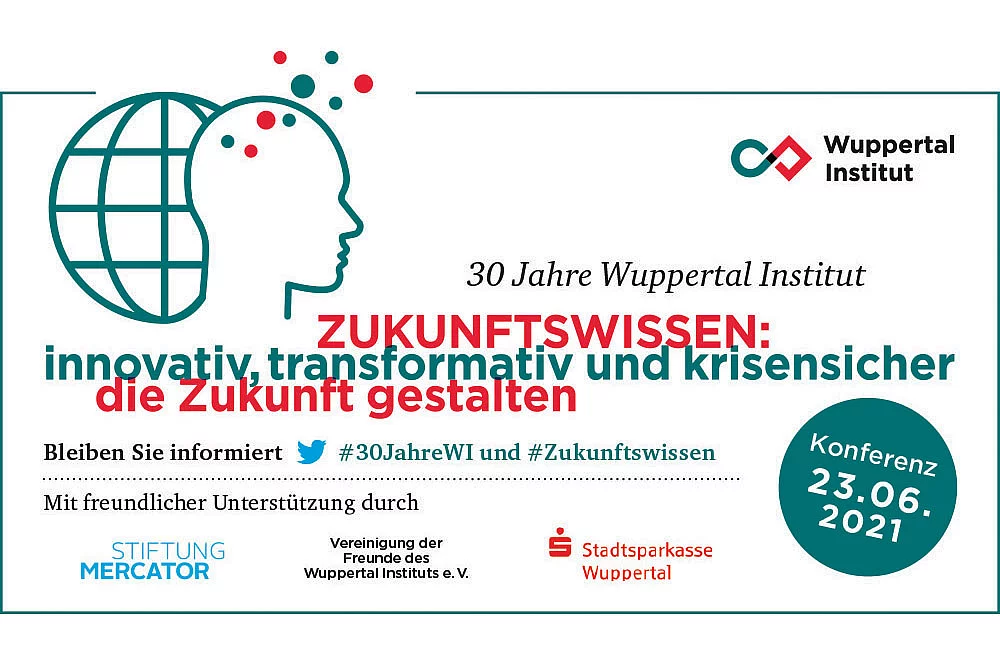 Das Wuppertal Institut feierte am 23. Juni 2021 sein 30-jähriges Bestehen und lud Interessierte herzlich zu der wissenschaftlichen Konferenz "ZUKUNFTSWISSEN: innovativ, transformativ und krisensicher die Zukunft gestalten" ein.